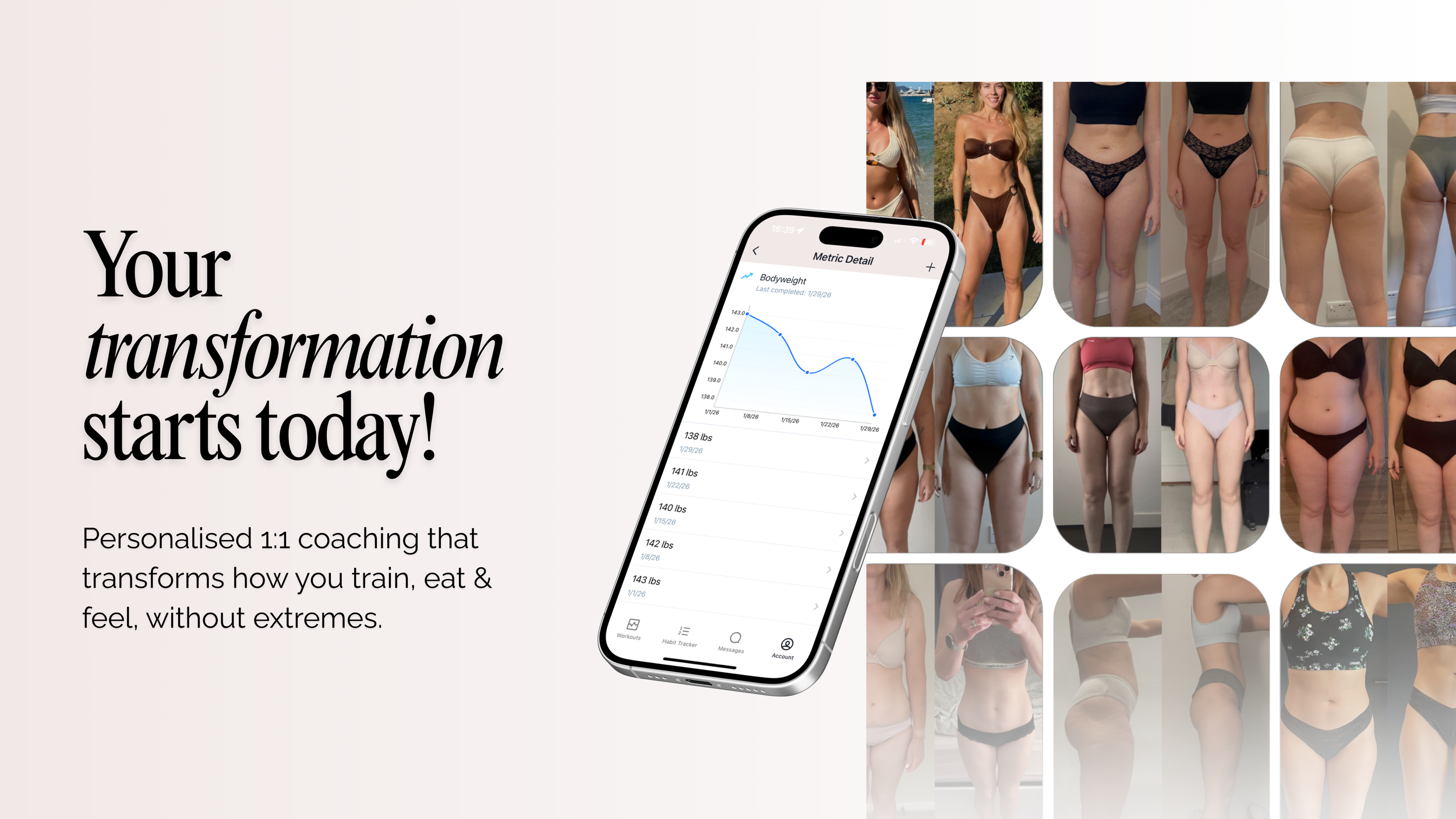 Space on the app to keep track of your progress including photos, measurements & calories
